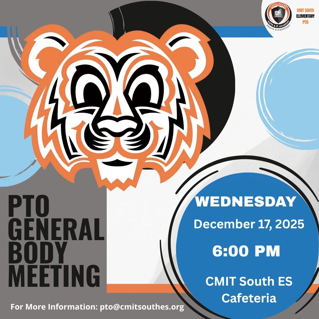 You're invited to attend our October PTO General Body Meeting! Please see the agenda items listed below. We encourage all members to attend, as your input and participation are vital to our school community.
